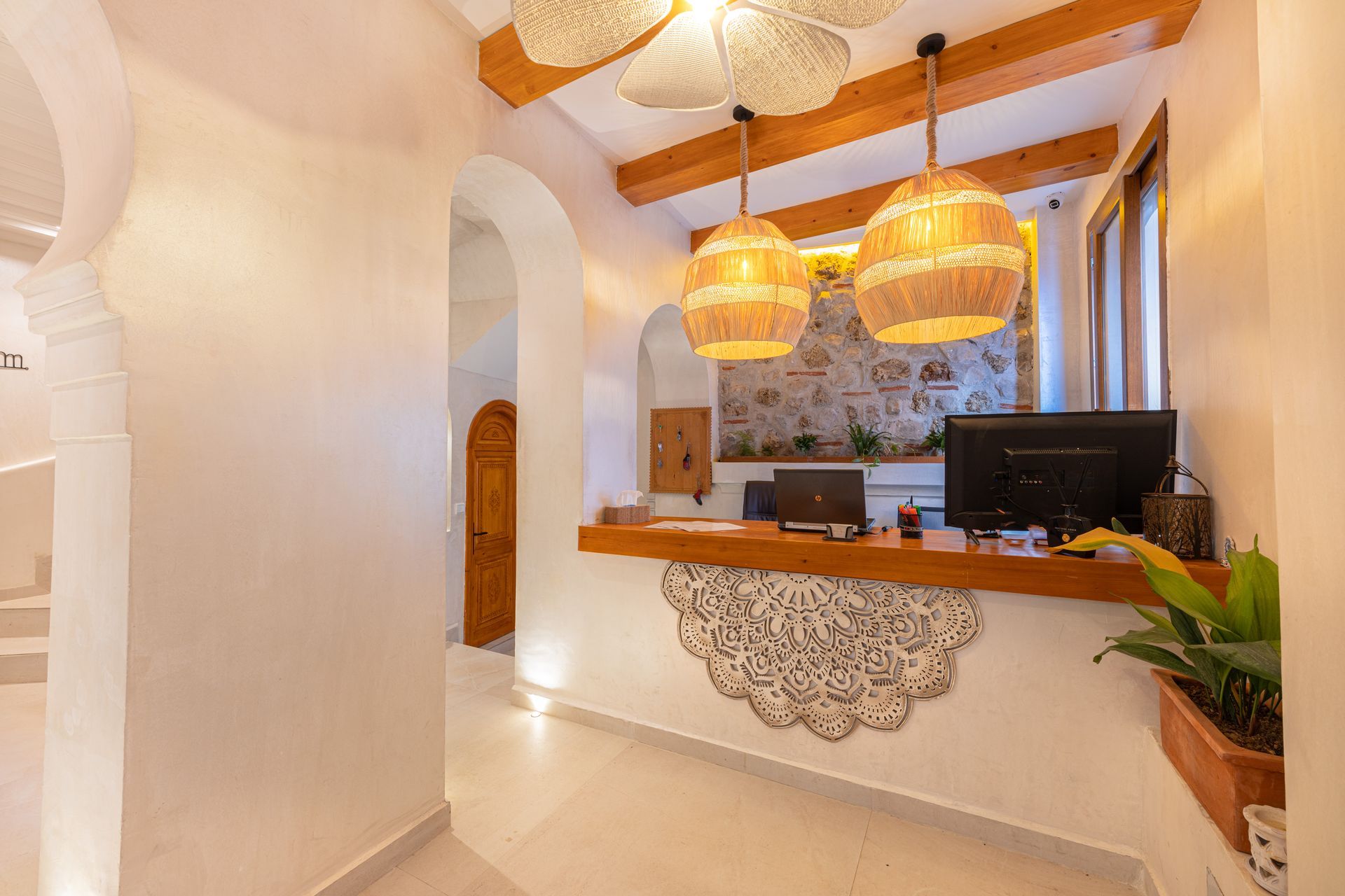 This is the heart of wellness and hospitality. Whether you choose our traditional Moroccan hammam or a restorative massage, these ancient purification rituals and therapies create moments of profound relaxation. This section also includes the reception area, a cozy fireplace, a covered terrace with panoramic windows, and its own central courtyard adorned with hanging lamps that illuminate the space with a warm and authentic light, as well as its crown jewel: the traditional fountain surrounded by lush greenery. Its rooms blend modern and traditional styles, delighting guests with their thoughtful and inviting decor